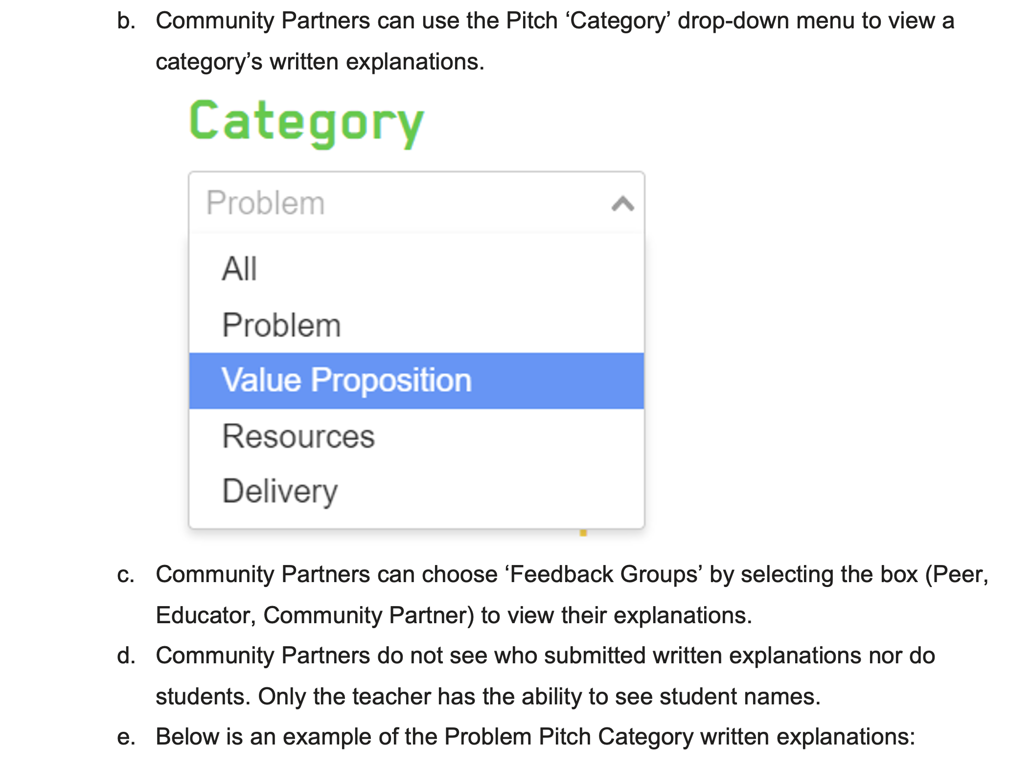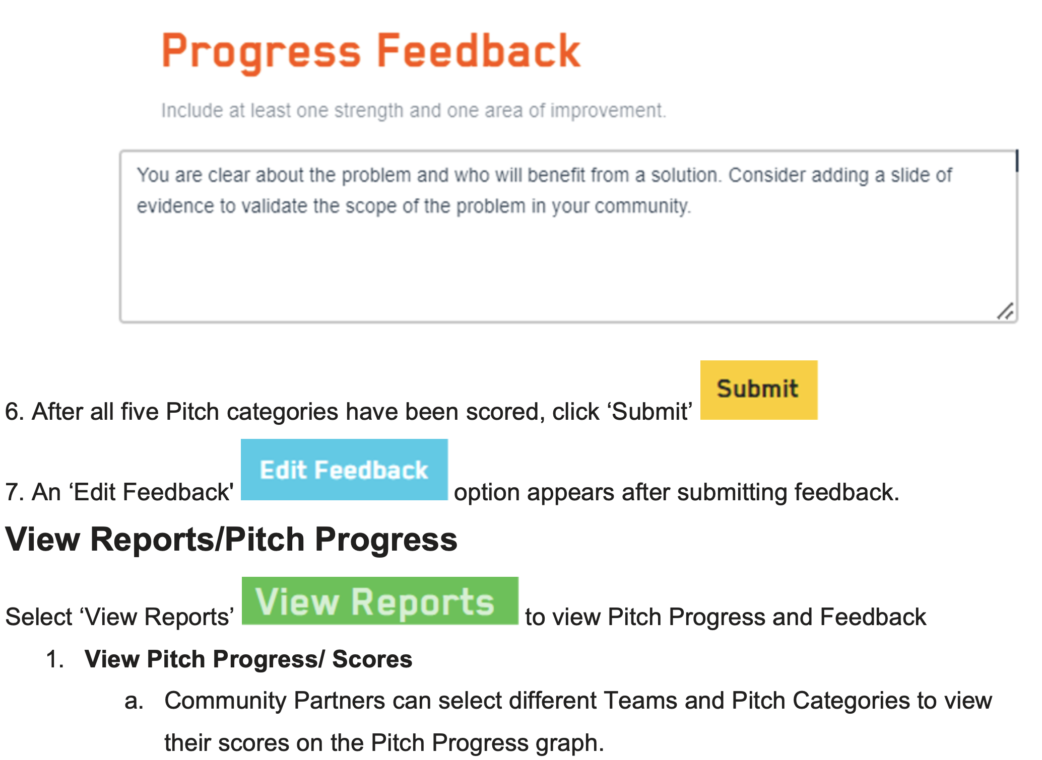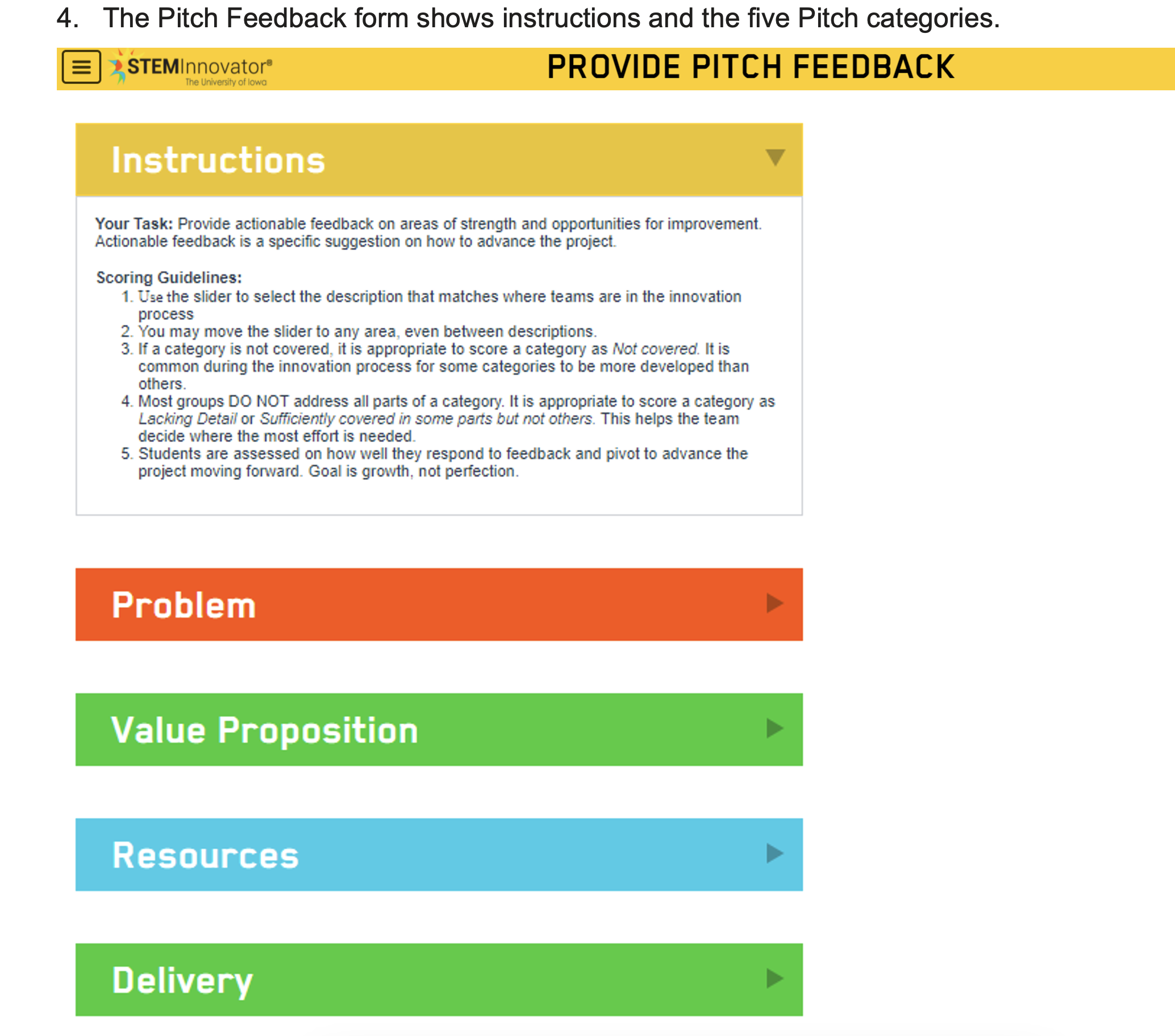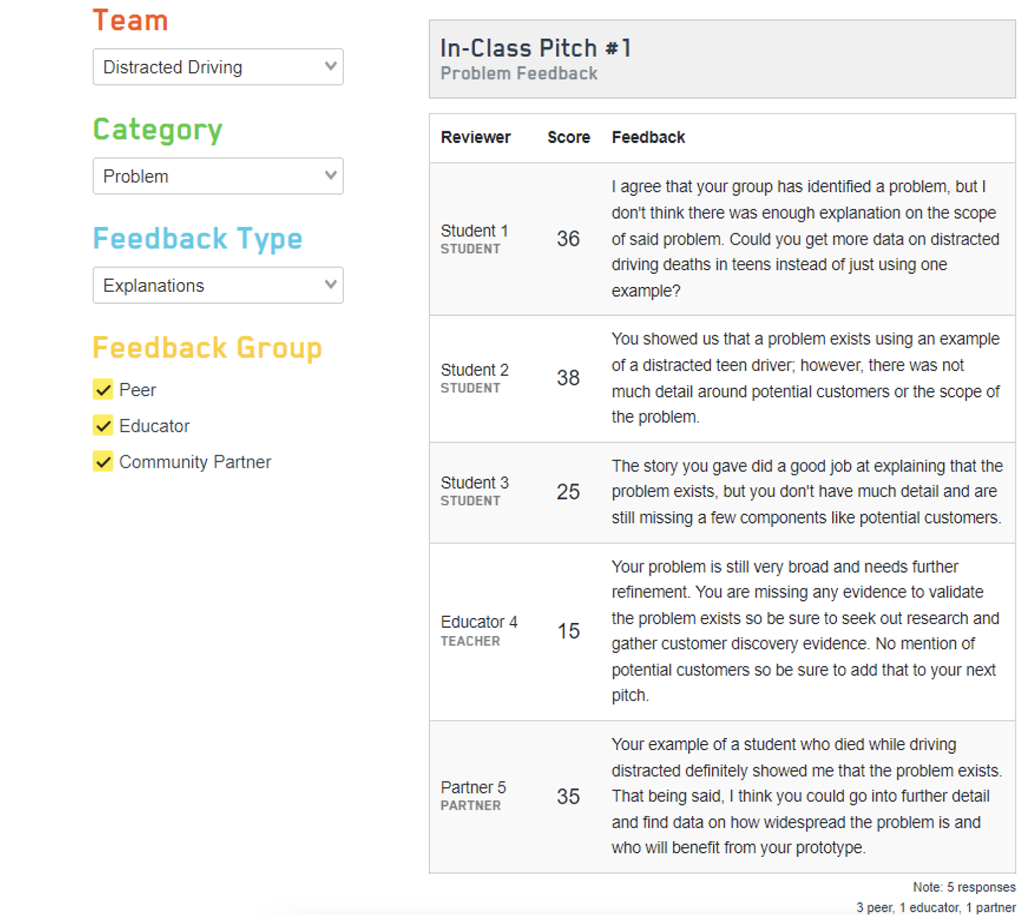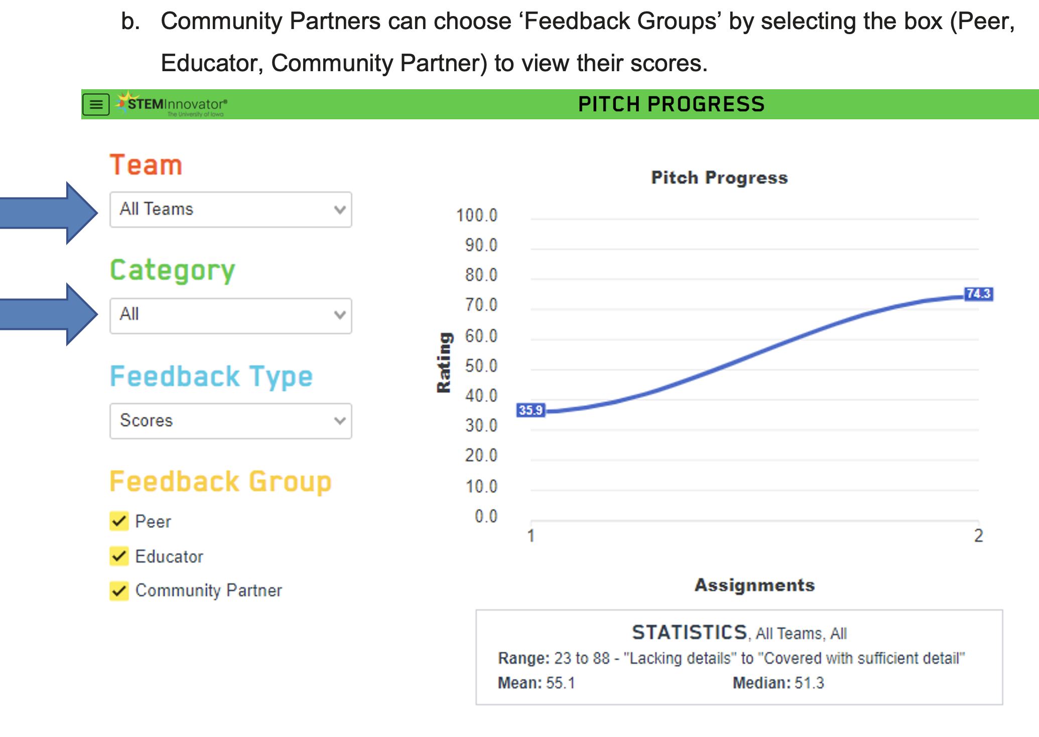 After a Community Partner creates a STEM Innovator® Portfolio account, they can access assignments created by the teacher. The Pitch assignment provides an opportunity for peers, Educators, and Community Partners to give feedback on student pitches.