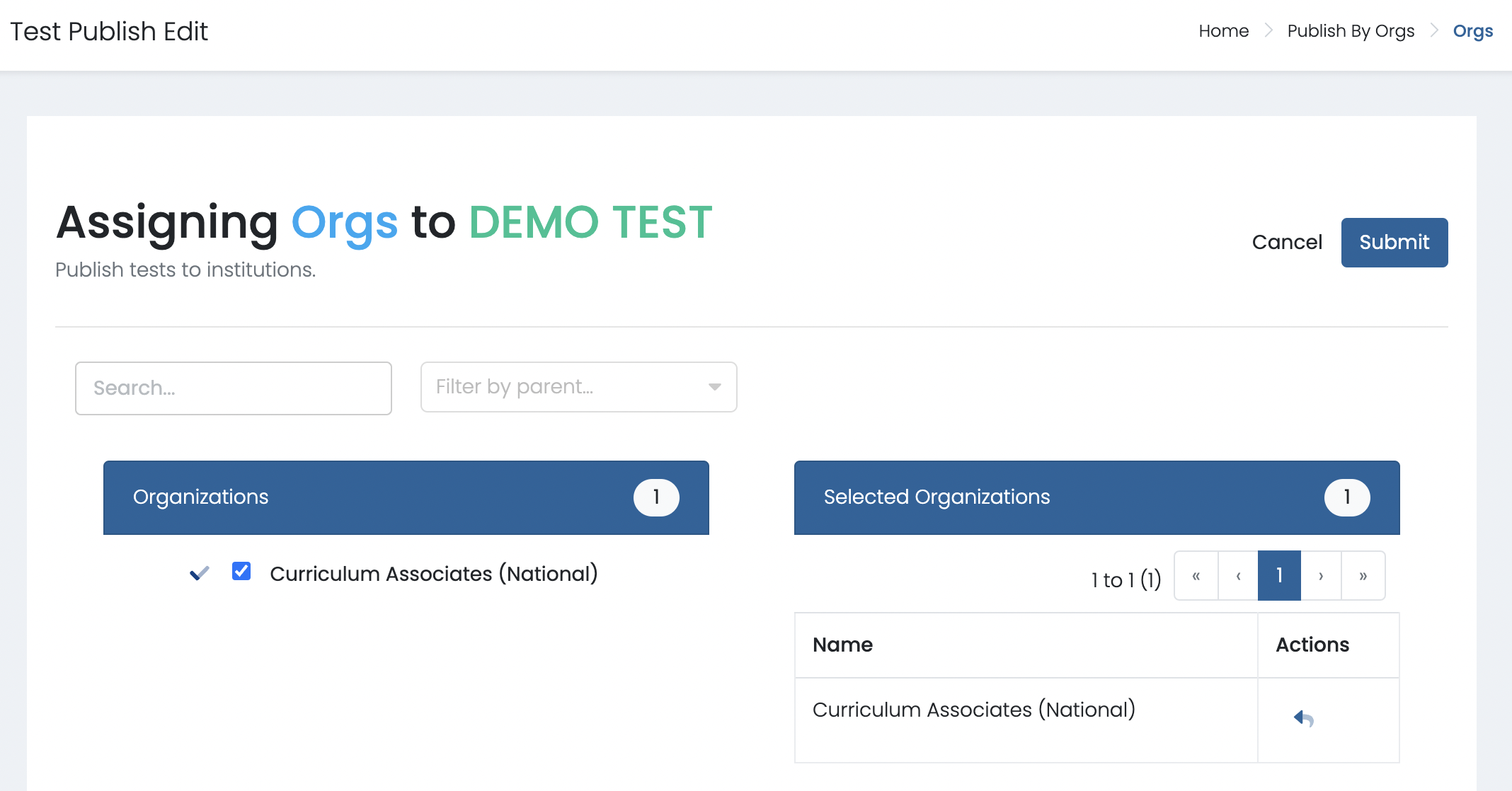 Changes to which orgs a test is published, only affects the Test DDL when creating new Deliveries, Practice Tests or Administrations. It does not change a user’s access to existing Deliveries, Practice Tests or Administrations.